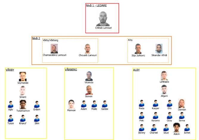 Vad som beskrivs nedan är undertecknads samt kollegors upplevelse av någon typ av hierarki och roller inom Vårbynätverket. Upplevelserna baseras på egna iakttagelser samt underrättelser och delar av förundersökningsmaterial i andra ärenden än förevarande som undertecknad tagit del av. Kategoriseringen bör inte ses som definitiv utan olika personer kan ha olika roller under olika perioder och i olika situationer.